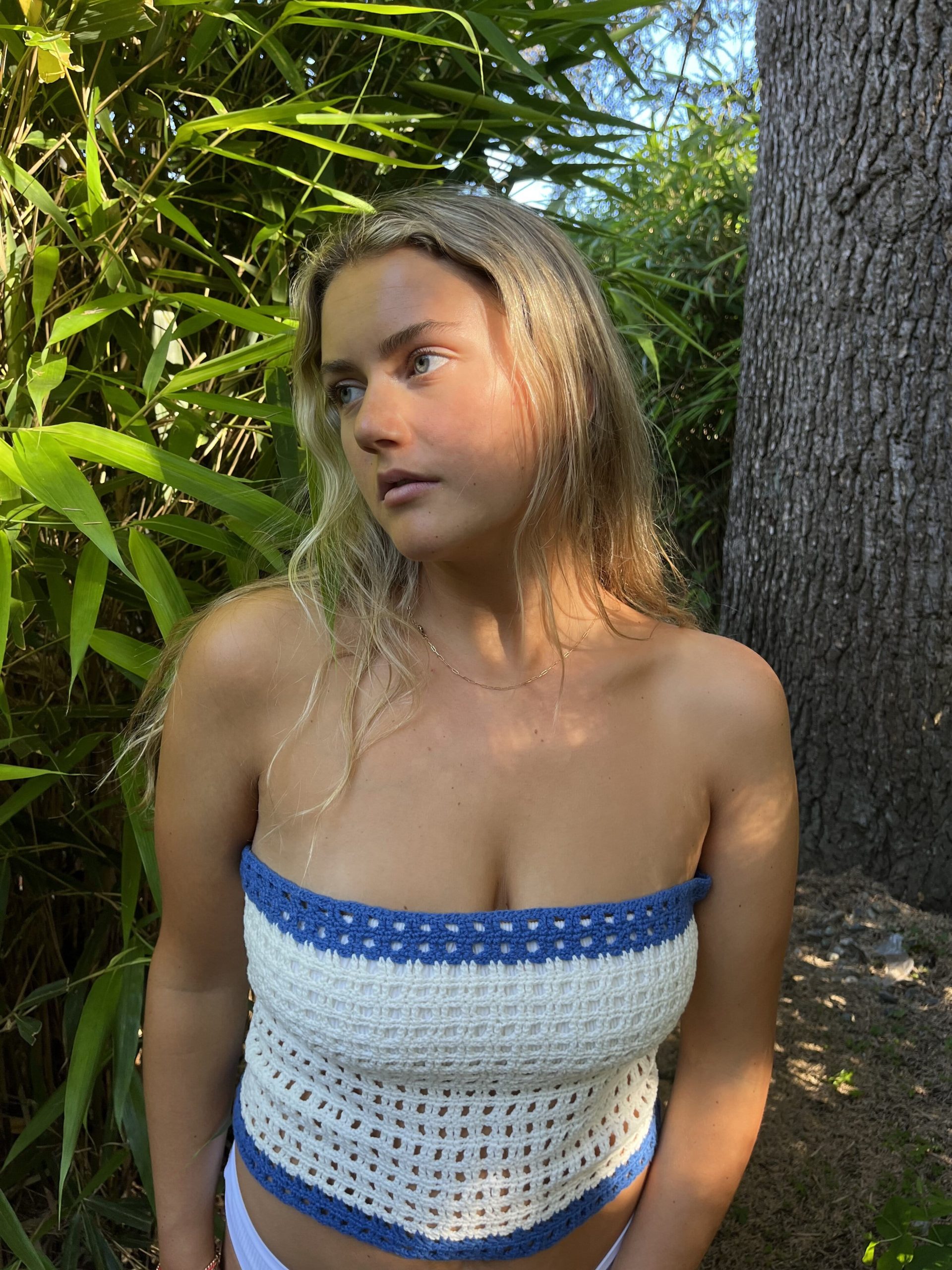 Lightweight acrylic crochet cropped tube top. Button side can be worn on front or back.